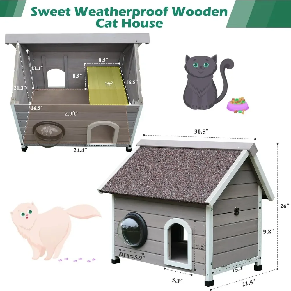 - [Weatherproof & Durable] - Outdoor feral cat house made of 100% fir wood, sturdy and durable construction, coated with water-based paint, harmless to pets. Features include a waterproof asphalt roof, 2 doors, PVC curtains, domed window, plastic feet, removable loft and floor. Suitable for all seasons, giving pets a safe home without having to worry about bad weather.