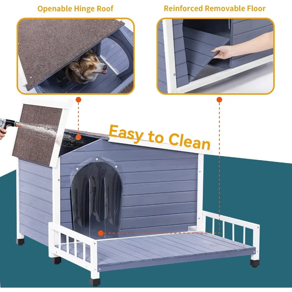 Dog House Outdoor with Terrace&Openable Asphalt Roof, 40" L X 47" W X 28.5" H,Outside Dog House with Elevated Floor,Dog House